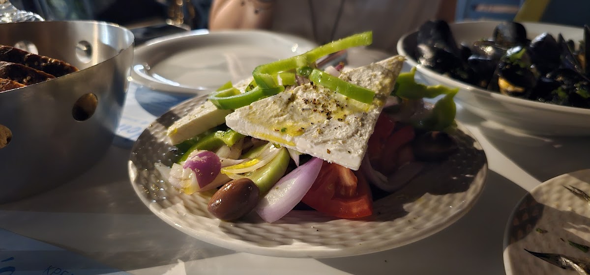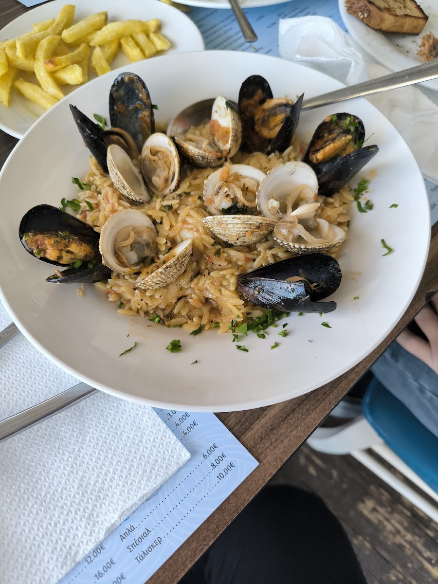 So pleased we tried this restaurant. My wife and I were staying in Patras for only two nights, and the meal here was one of the highlights of the trip. Perfect setting on the shore facing the setting sun, a spectacular setting. We had the seafood paella a dish for two. The flavour was just right with a good mixture of seafood, large prawns and large juicy mussels. We were also pleased to find that the menu was reasonably priced.